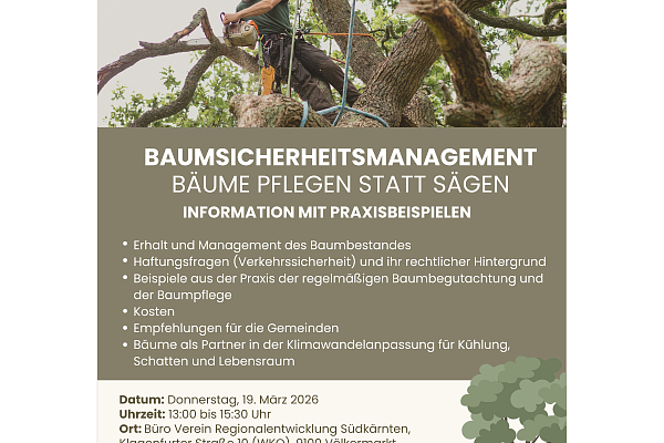 In einem Workshop der Klimawandel-Anpassungsmodellregion (KLAR!) Südkärnten zeigen wir am Donnerstag, 19. März 2026 praxisnah, wie regelmäßige Baumkontrollen funktionieren, welche Pflegemaßnahmen sinnvoll sind und warum gesunde Altbäume auch wichtige Faktoren für Klimaschutz, Klimawandelanpassung und auc zum Wohlfühlen sind.